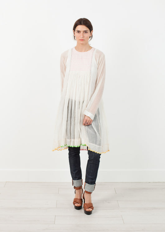 This dress provides just enough color to hint warmer temperatures while remaining universally seasonless. Intricate gathers and paneling throughout adds to the piece's eclecticism. Completely handmade, stitched, and embroidered. Long sleeves with silk cuffs,and a natural, loose silhouette. Single button closure at center back. Pero. Color White. 50% Cotton, 50% Silk. Made in India. Lana is wearing a size 38.