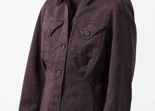 The Poldo Jacket is fantastically durable, yet lightweight. Button placket closure at front. Two exterior button pocket at front. Labo.Art. Color Congo. 77% Cotton, 23% Linen. Made in Italy. Ashley is wearing a Size 1.