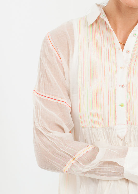 This blouse top provides just enough color to hint warmer temperatures while remaining universally seasonless. Intricate paneling and gathers throughout adds to the piece's eclecticism. Completely handmade, stitched, and embroidered. Long sleeves with silk cuffs, a naturally loose silhouette. Single button placket opening. Tailored collar. Pero. Color White. 50% Cotton, 50% Silk. Made in India. Lana is wearing a size 38.